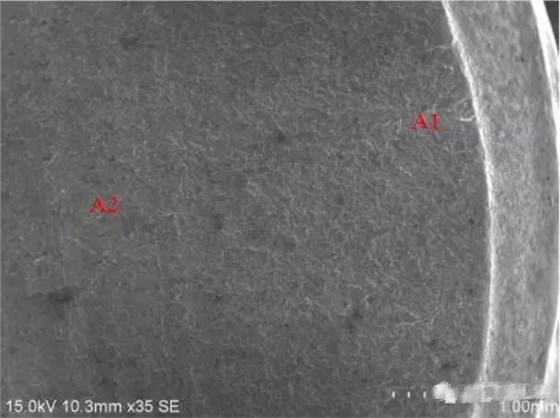 圖6~8所示為A區(qū)形貌,可見(jiàn)該區(qū)斷口靠近邊緣(A1區(qū))存在輪輻狀臺(tái)階,微觀可見(jiàn)磨損痕跡,靠近芯部(A2區(qū))可見(jiàn)疲勞輝紋。